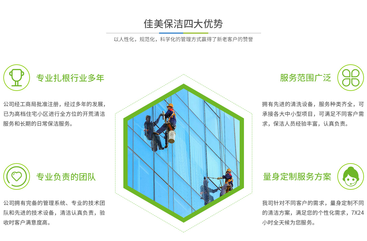 馬鞍山市佳美保潔服務(wù)有限公司是一家經(jīng)工商部門批準(zhǔn),具有法人資格專業(yè)清洗,馬鞍山保潔服務(wù)的公司,自創(chuàng)辦以來(lái),一直致力于企業(yè),家庭,賓館,學(xué)校,別墅,酒店,商廈,公共設(shè)施等場(chǎng)所提供科學(xué)的日常保潔和清潔保護(hù)的服務(wù)公司,有著豐富的管理服務(wù)和保潔經(jīng)驗(yàn)...